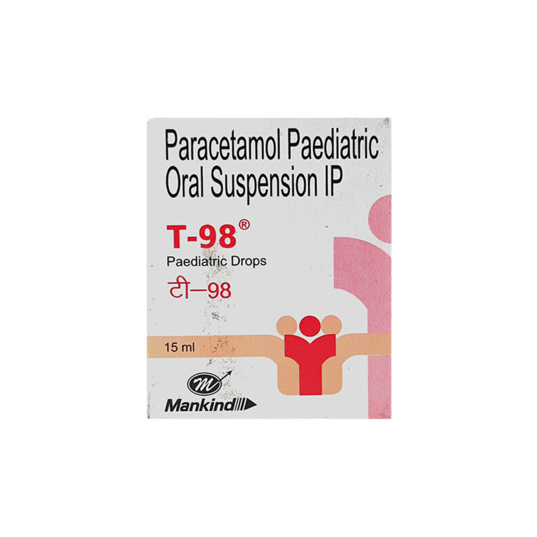 T-98 Paediatric drops is used to reduce fever and relieve pain in children. It contains paracetamol/acetaminophen as the active substance which prevents the action of certain substances responsible for pain and increasing body temperature. Shake the bottle well before use. Taking paracetamol for a prolonged duration and in high doses is associated with liver damage. Hence, give T-98 Paediatric drops to your child in the exact dose and quantity as advised by your doctor.